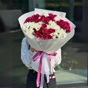 This bouquet captures the perfect balance of purity and passion. Its frosted hues and delicate petals create a refined expression of elegance and warmth, wrapped in the gentle embrace of nature’s finest colors.