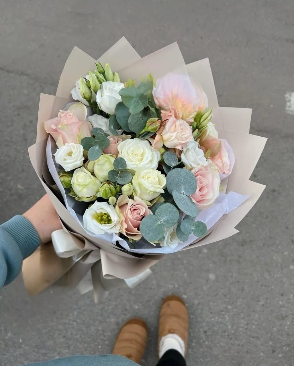 A soft and graceful blend of pink roses, white roses, spray roses, lisianthus, and eucalyptus. Perfect for expressing gentle affection, calm elegance, or a thoughtful gesture — all beautifully arranged with a timeless touch.