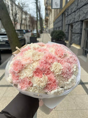 Lush Embrace is a captivating bouquet of 51 hand-picked carnations in delicate shades of white and pink. Symbolizing admiration, affection, and pure love, this arrangement is perfect for celebrating heartfelt moments. Each bloom is carefully arranged to create a soft, romantic aesthetic that speaks of elegance and grace. Whether it’s for a special occasion or a spontaneous gesture of love, Lush Embrace delivers a message that words alone cannot express.\n\nPink Carnation - 26\n\nWhite Carnation - 25