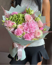 A dreamy blend of soft pink and fresh green — featuring pink and green hydrangeas, pink roses, lisianthus, and Veronica blooms. This garden-inspired arrangement brings gentle charm and fresh elegance to any occasion.\n\nHydrangea - 2\n\nVeronica - 5\n\nRoses - 5\n\nLisianthus - 3