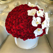 Orchid Kiss – An enchanting box of 150 lush red roses crowned with a single elegant Phalaenopsis orchid stem, symbolizing passion intertwined with grace. This luxurious arrangement is the perfect blend of romance and sophistication, crafted to leave a lasting impression on the one you adore.
