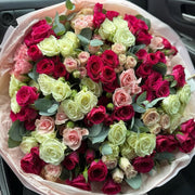 A delicate harmony of 35 spray roses in soft white, blush pink, and vibrant fuchsia, accented with 5 stems of fresh eucalyptus for a touch of natural elegance. Rosé Whisper is the perfect bouquet to express grace, love, and charm in a timeless, modern style.