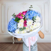 Soft blue hydrangeas, white chrysanthemums, and pink baby garden roses flow with eucalyptus, creating a bouquet that feels airy, tender, and effortlessly elegant, perfect for moments meant to feel romantic, and adding a sweet, cozy touch to any special moment.