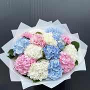 A graceful bouquet of 15 lush hydrangeas, delicately arranged in a trio of shades — pure white, soft pink, and serene blue.