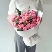 Romantic bouquet where dark pink garden baby roses emerge gracefully through soft eucalyptus greenery, creating a whisper of mauve elegance.
