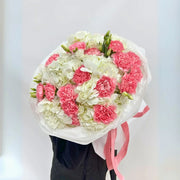 Fresh and airy bouquet where white hydrangeas meet salmon-peach carnations, creating a harmonious blend of soft elegance and gentle warmth, flow together like a soft breeze, evoking serenity, warmth, timeless elegance and gentle sophistication.