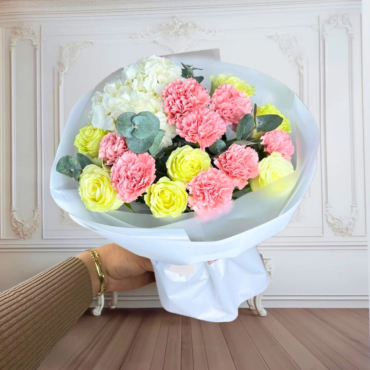 A charming, medium-sized bouquet where white roses and peach carnations mingle with soft white hydrangeas. This arrangement exudes tender warmth, delicate elegance, and playful charm, perfect for adding a sweet, cozy touch to any special moment, forming a bouquet that’s playful, tender, and irresistibly charming.